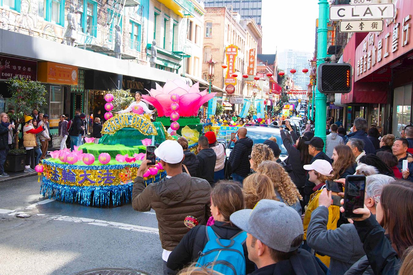 从北京来旧金山旅游的年轻夫妇,第二天就要回国就临时决定逛中国城时,巧遇法轮功学员在旧金山中国新年游行队伍,感到欣喜万分,一直拿手机拍照。