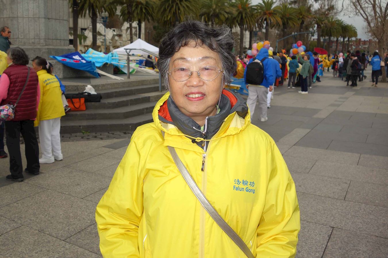今年已经八十岁的夏瑰琦阿姨也参加了游行。她修炼前身体很糟糕,自己感觉都要不行了,修炼法轮功二十多年来,没有得过一次病。她说:“我现在到了八十岁比我六十岁还好。”得法修炼,让她打开了心结,“心情好了,病也好了。心胸开阔了,心也开朗了。”
