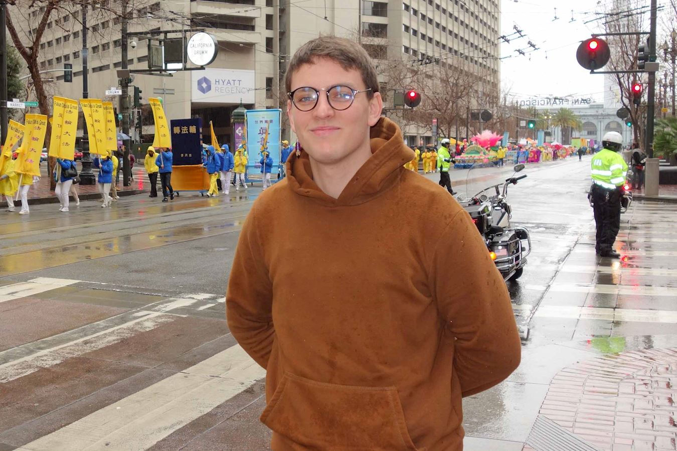 来自法国的小伙子Amaury,看到法轮大法天国乐团经过,不由地举起手机录像,他说:“这个乐团演奏得太好了,音乐很棒!我很喜欢。”他表示,能在这里遇到这样的新年游行,很幸运。“能了解文化,看到美丽的服装,很开心。”他说,“新年快乐!”