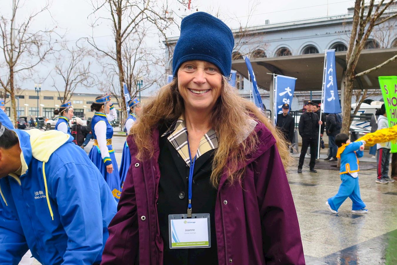 从外州来旧金山参加会议的乔安妮·黑斯廷斯(Joanne Hastings),在休息时间到外面走走,当她听到祥和的音乐就好奇的前来,看到法轮功学员正在炼第五套功法就驻足观看。
