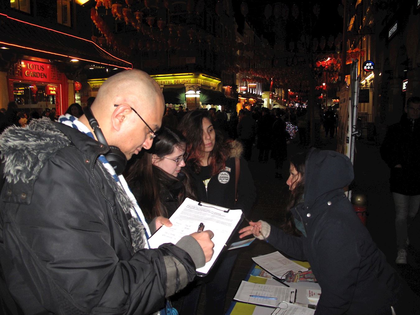 ![]() 图3:二零一九年二月十日,几百人在伦敦唐人街签名支持法轮功学员反迫害。 |