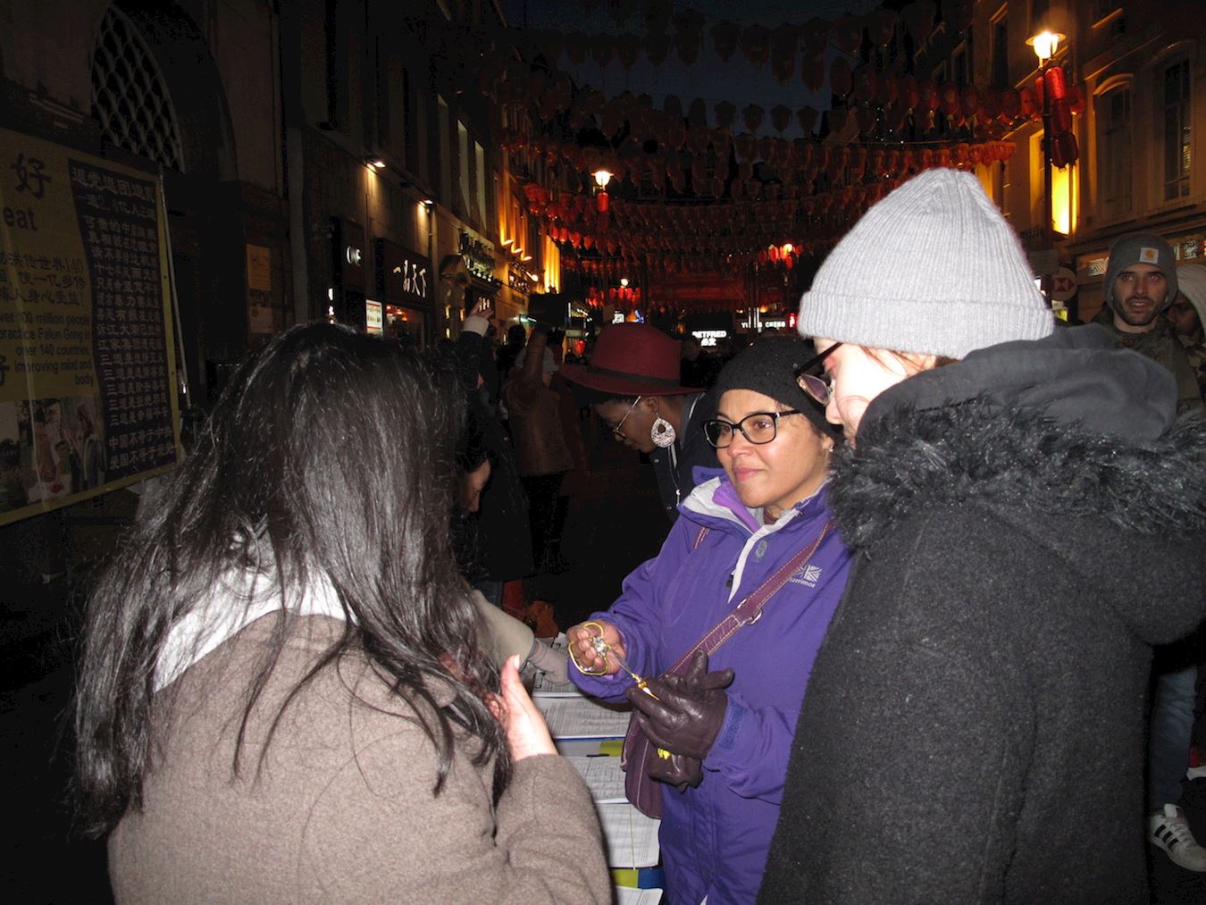 ![]() 图7:二零一九年二月十日晚,印度裔女士劳娜(Launa,居中者)和有希腊血统的弗朗西斯(Francis,前右一)在伦敦唐人街了解到法轮功属于古老的修炼文化。 |
