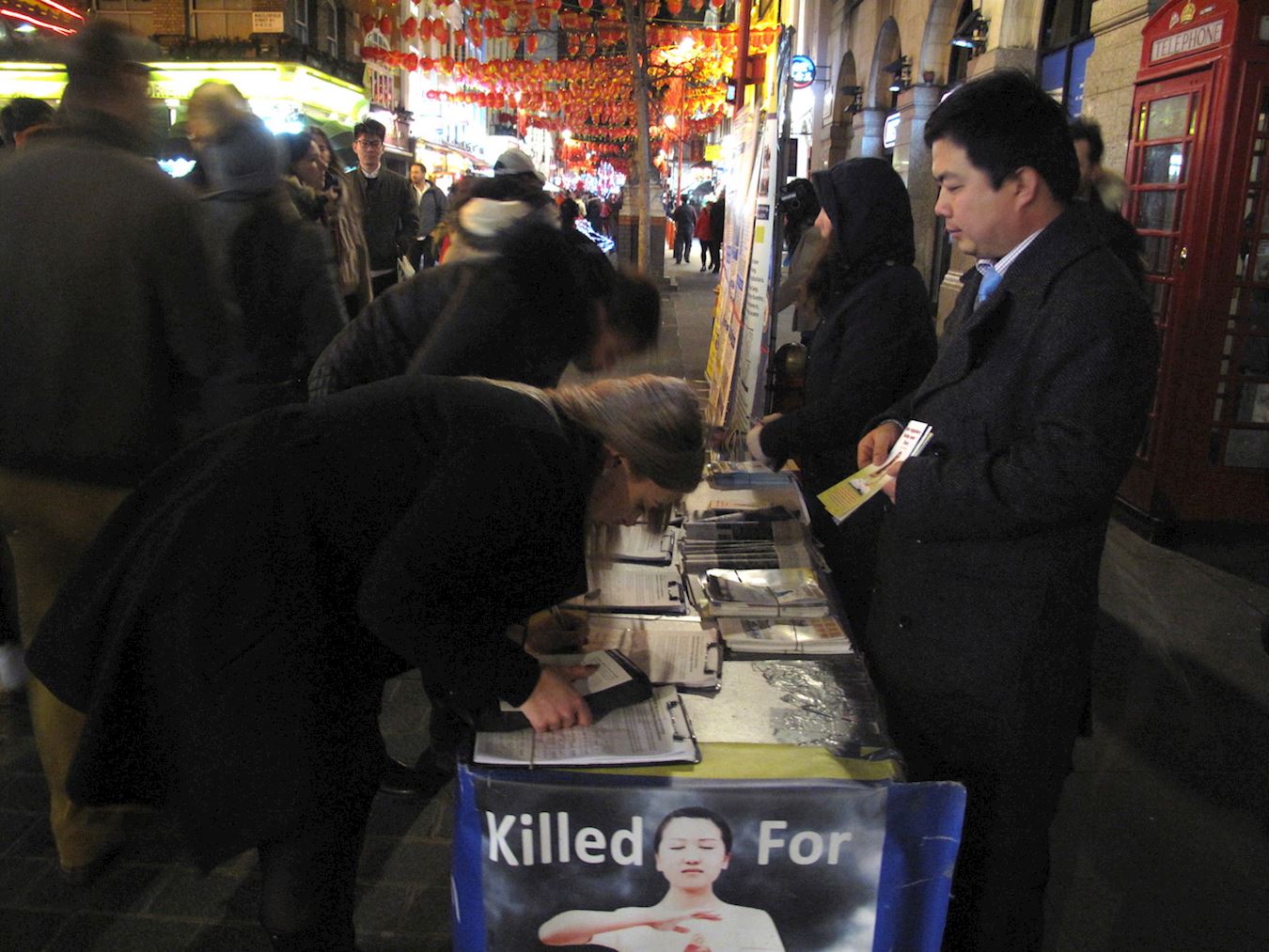 二月十日晚,在伦敦工作的瑞典女士伊丽萨白带着从家乡来伦敦旅游的朋友玛娅,在伦敦唐人街第一次接触法轮功,了解中共残酷迫害法轮功罪行后二人立即在要求制止中共迫害的征签表上签名,她们表示坚决支持法轮功反迫害,因为维护平和信仰对人类很重要。“我们认为每个人都应该有选择自己想做什么的权利,只要不对他人构成伤害,何况这里(法轮功)是那么平和的打坐。”玛娅说。