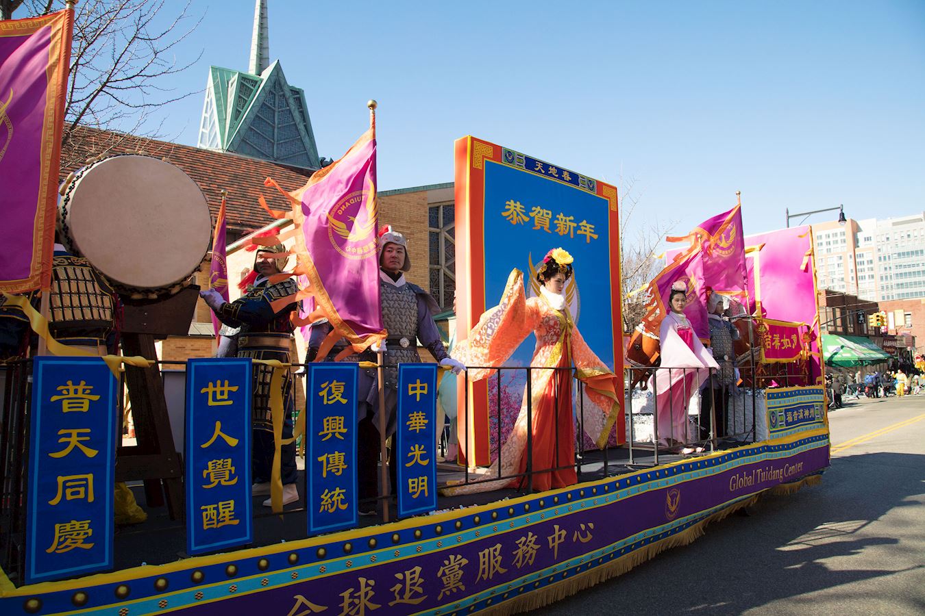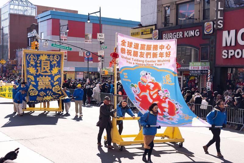 锣鼓喧天,狮舞龙腾,一片喜气声中,全球退党服务中心的“凤凰”花车缓缓驶来。花车上,旌旗招展,武士擂鼓助阵,身着唐装的仕女浅笑嫣然。全球退党服务中心给大家拜年,祝大家珍惜机缘,赶紧三退,远离邪灵获新生。