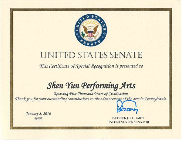 ![]() 图11:美国联邦参议员图米(Patrick Toomey)在褒奖信中称赞:“神韵艺术团对复兴五千年神传文化作出了贡献。感谢你们对宾州艺术发展的卓越成就。” |