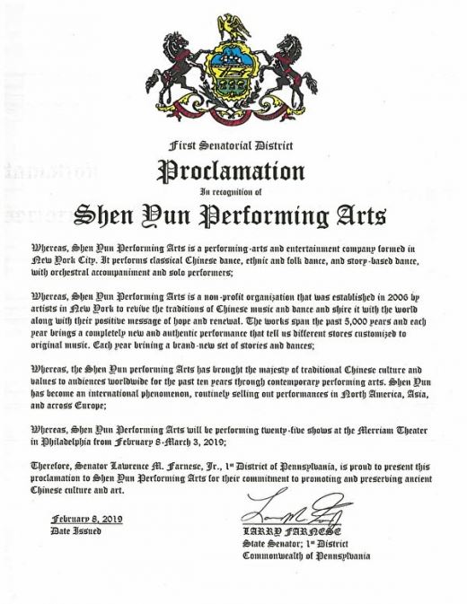 ![]() 图12:宾州州参议员法尼斯(Lawrence M. Farnese)给2019费城神韵演出的贺函。 |