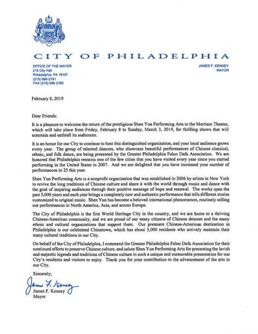 费城市长杰姆斯·肯尼(James Kenney)为过去的十三年神韵带给费城丰富而又美妙的中华文明与传说致意。他真心感谢神韵对费城文化做出的杰出贡献。