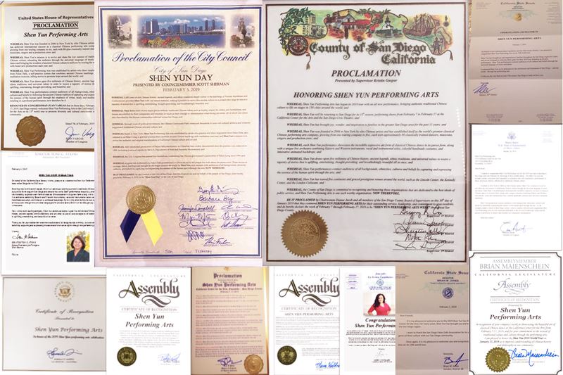 神韵艺术团二零一九年巡演再临加州圣地亚哥之际,当地二十六位各级政要颁发贺信或褒奖,感谢神韵艺术团为弘扬传统文化做出的贡献。作为一县之首的圣地亚哥县监察委员会(Board of Supervisors)宣布,神韵演出的两周为“圣地亚哥县神韵周”。