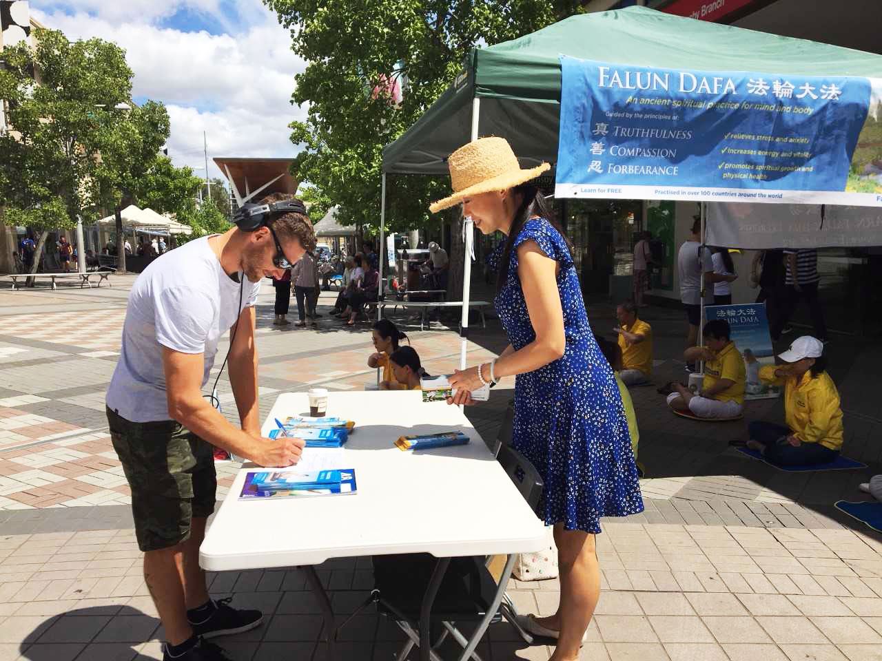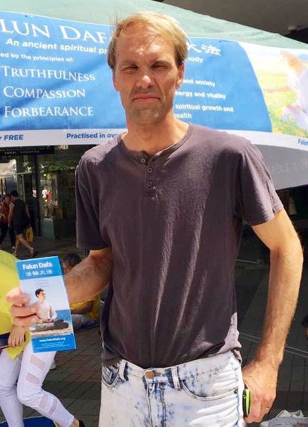 当地一位建筑师保罗·弗里曼(Paul Freeman)路过法轮功展位时,友善地接过学员递给他的真相单张,他看了一会后和法轮功学员开始详细交谈,之后他表示:“每个人都有信仰权利,作为一名基督徒,我非常支持被中共迫害的法轮功修炼者,他们是我的兄弟姐妹,我们应该互相帮助。我不知道能做些什么,但我愿意做点什么来帮助停止这场迫害。”法轮功学员告诉他可以到网上签停止迫害的请愿书,他认真地在单张上找到了网址,说他会去签字支持制止中共迫害法轮功。