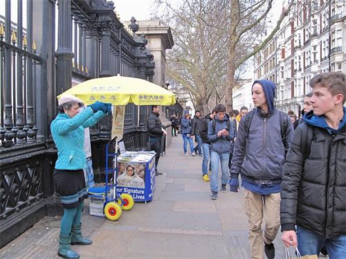 当天下午,一位在中国大陆工作的台湾女子在大英博物馆前与一位法轮功学员交谈后改变了对法轮功的看法,随后她签名支持法轮功学员反迫害。她说自己知道台湾有很多人炼法轮功,但她以前有些回避法轮功,觉得对她来说太神(spiritual)了,对法轮功的反迫害活动她也没有认真思考过。现在她认识到法轮功打坐修行是对人很有益的生活方式,中共迫害法轮功是在加害无辜,世界各地的法轮功学员要求停止迫害是义举,应该得到支持。她说:“我认为在这里讲真相是很重要的,应该让更多人了解(法轮功学员的正当反迫害诉求),这么多人(因为信仰)在受苦受迫害,不该这样。”临走时她鼓励法轮功学员“加油”。