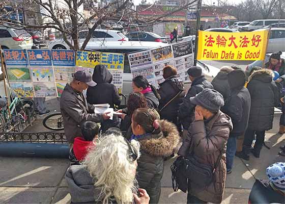 二月十日,年初六,在纽约布碌伦八大道的真相点上,“法轮大法好”的横幅已经挂好,法轮功学员给当地华人新年送福。