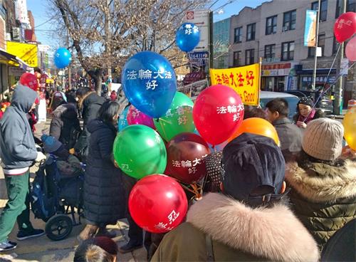 当天是纽约第三大华人社区——布碌伦八大道,一年一度庆祝华人新年的日子,也是法轮功学员们给当地的父老乡亲拜大年送真福劝三退(退出中共党团队)的好日子。法轮功学员的新年礼物——彩色氢气球,受到民众的青睐。年轻的父母带着孩子,年长的爷爷奶奶带着孙儿孙女,人们一波一波地汇聚过来讨气球要吉利。学员们一边开心地帮他们把气球系好,一边热情地向大家介绍气球上的九字吉言——“法轮大法好,真善忍好”,并把准备好的最新一期明慧期刊《天赐洪福》送给大家,告诉众人:“法轮功是佛家高德大法,真心念九字吉言,真的会天赐洪福。”同时和每个人分享“天要灭中共,三退保平安”的天机。