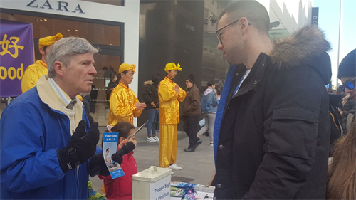 来自都柏林的一位小伙子在看过法轮功被迫害的展板后心情非常沉重,默默地在征签信上签名后,他向爱尔兰裔学员麦克尔询问了很多问题,希望能够了解更多的真相,并询问自己如何能帮忙。