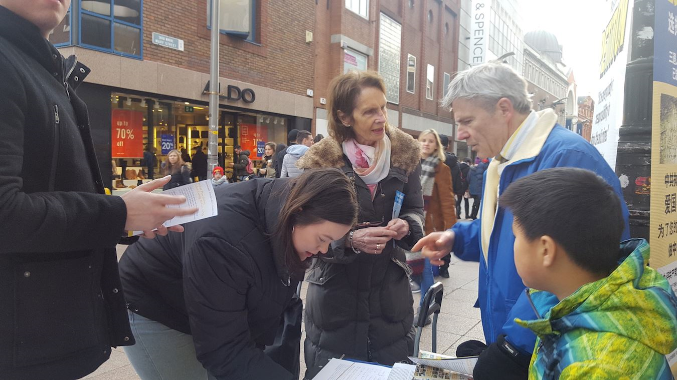'图1~3:爱尔兰法轮功学员在首都都柏林的繁华商业街亨利大街上和民众交谈,传播真相'