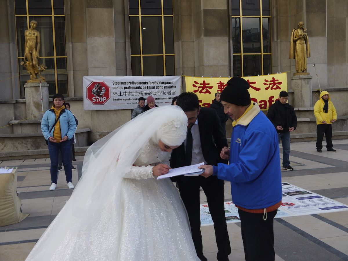 ![]() 图4:新娘在征签表和上签字,支持法轮功学员。 |