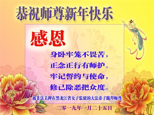 被非法关押的大陆大法弟子在致师尊的新年贺词中这样写道:“师尊,我们虽身处最最黑暗之地,但我们坚定的相信,黑暗即将过去,光明即将来临。我们有师尊保护,无怨无悔!我们听师尊的话,守住善念,慈悲救人。”“请师尊放心!恭祝师尊新年好!”