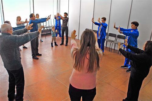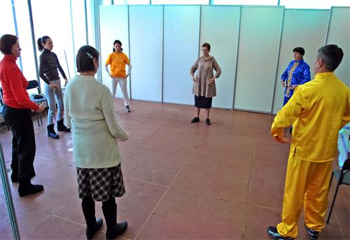 她接着问:“好的,这个问题明白了,在这个信息单上很好的介绍了法轮功,我们立即明白这是一个好方法,效果很好,虽然我个人可能因为我的年龄而无法做到,我已经80多岁了。”学员说:“各个年龄段的人只要想的话,都可以学炼这个功法。炼功动作很简单,不需要特殊的体能准备。”