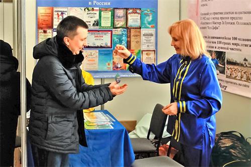 许多俄罗斯民众仔细阅读传单后,对法轮功非常感兴趣也想要学炼,其中一位已经退休的女士特别感兴趣,和学员详细地询问了起来。