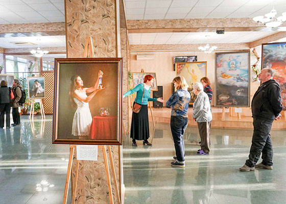 在俄罗斯度假小镇五山城,真、善、忍国际美展随着春天的到来开幕。当地法轮功学员希望通过美展将真、善、忍的光明分享到人们的心中。