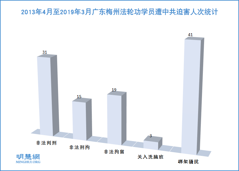 ![]() 图:2013年4月至2019年3月广东梅州法轮功学员遭中共迫害人次统计 |