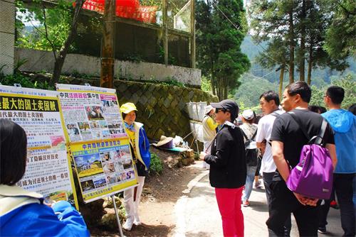 “大家快看吧,这是台湾最高海拔上的法轮功。”一位导游指着阿里山一排法轮功真相展板,告诉来这里旅游的大陆客。香林国中是地处台湾最高海拔的学校,导游幽默的语气,鼓励游客们赶快去了解法轮功的真相,随后导游转向一位法轮功学员打招呼:“我又来了。”