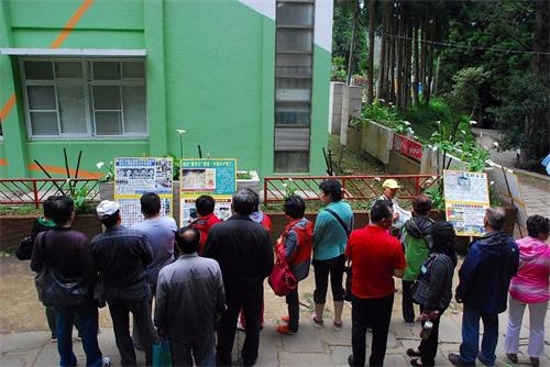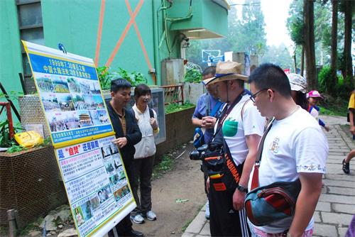 从“三代木”那边步上石阶,一直到“阿里山博物馆”,这是游阿里山园区必经的路,法轮功学员在这里摆大法真相广告牌,向游客洪扬大法,讲清法轮功受中共迫害真相,劝三退(自愿退出中共的党,团,队组织)。“欢迎到阿里山来,了解真相、三退保平安,远离共产党。”几位法轮功学员向步上石阶走过来的一群群大陆游客用平和的语气说。
