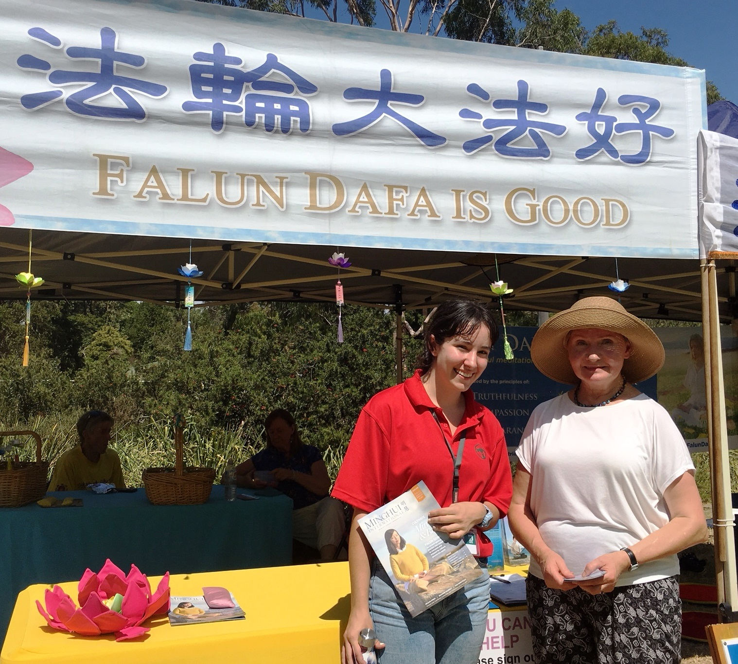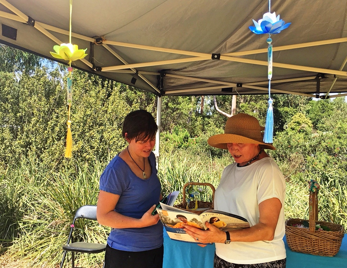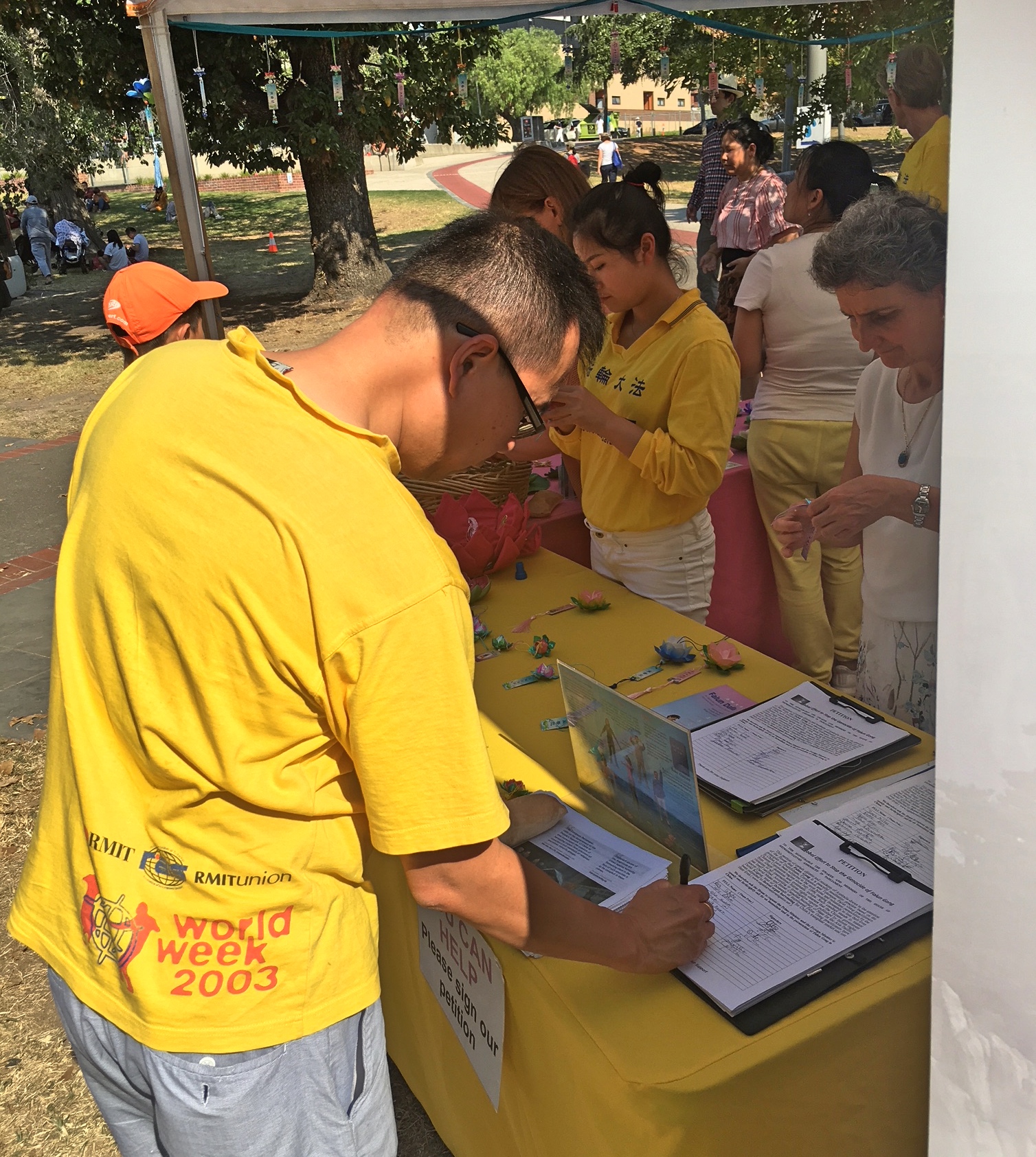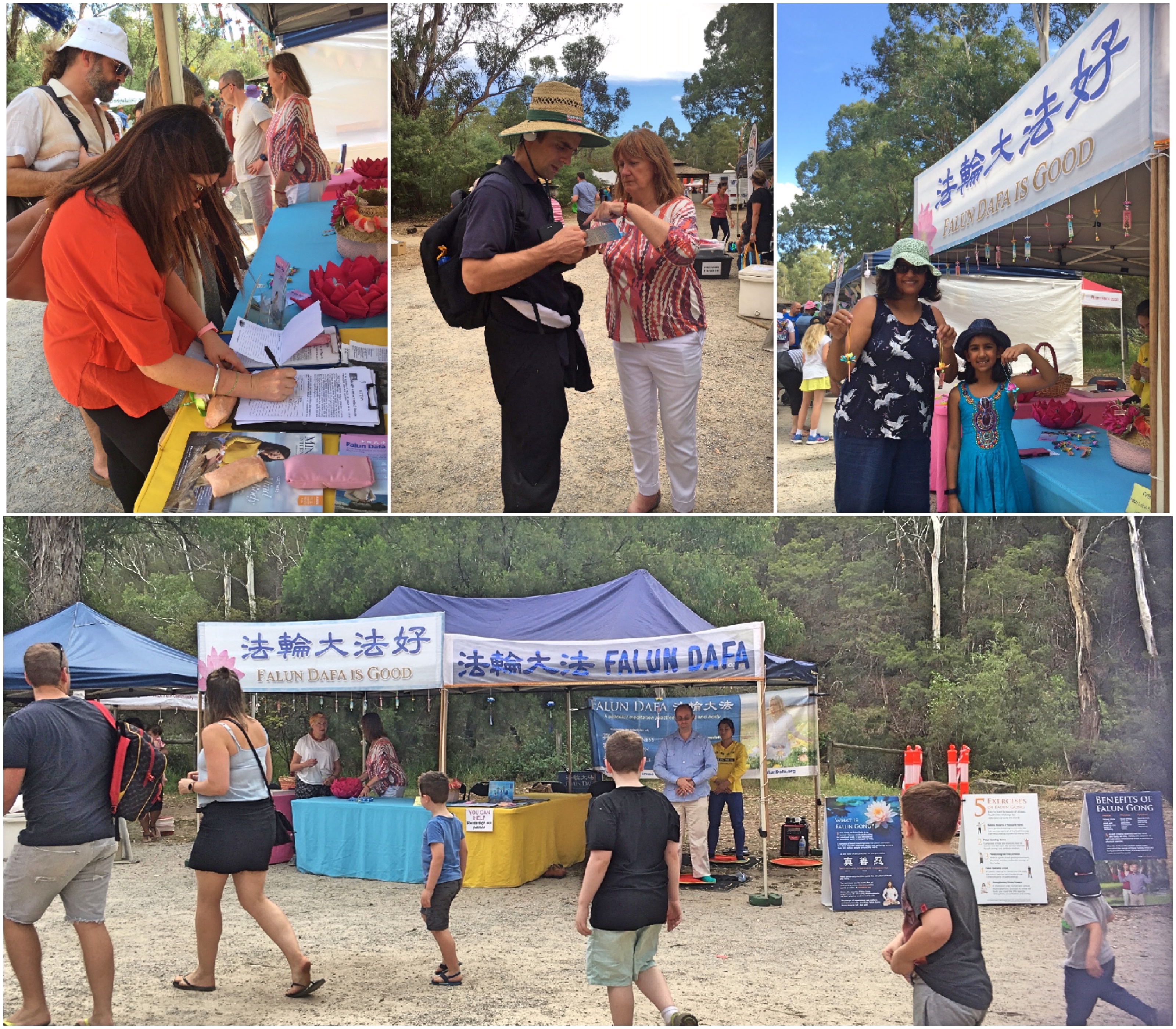 ![]() 图1: 二零一九年三月二十四日,曼宁汉姆市议会(Manningham City Council)举办的年度节庆Warrandyte Festival 吸引万余市民和游客,图为法轮大法展位上,民众了解真相后在征签表上签名,以及美丽莲花带给孩子和家长的欣喜。 |