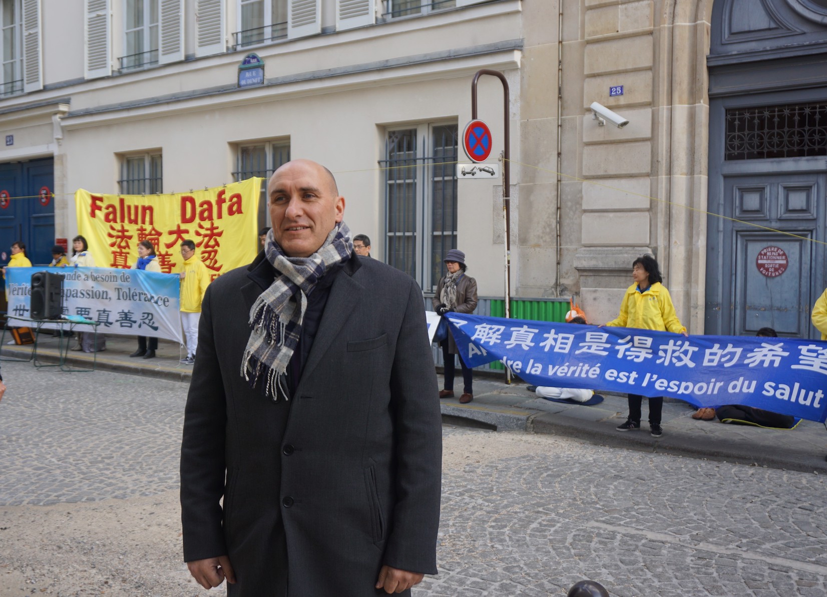 加布德律师说:“这次集会地点一开始给我们的根本不是这里,而是离中国大使馆很远的街区,我们又上诉了,警察局没等开庭就撤销了原批文,允许我们在中使馆前集会。法国有职责支持所有争取人权的抗争,包括今天这个活动。”