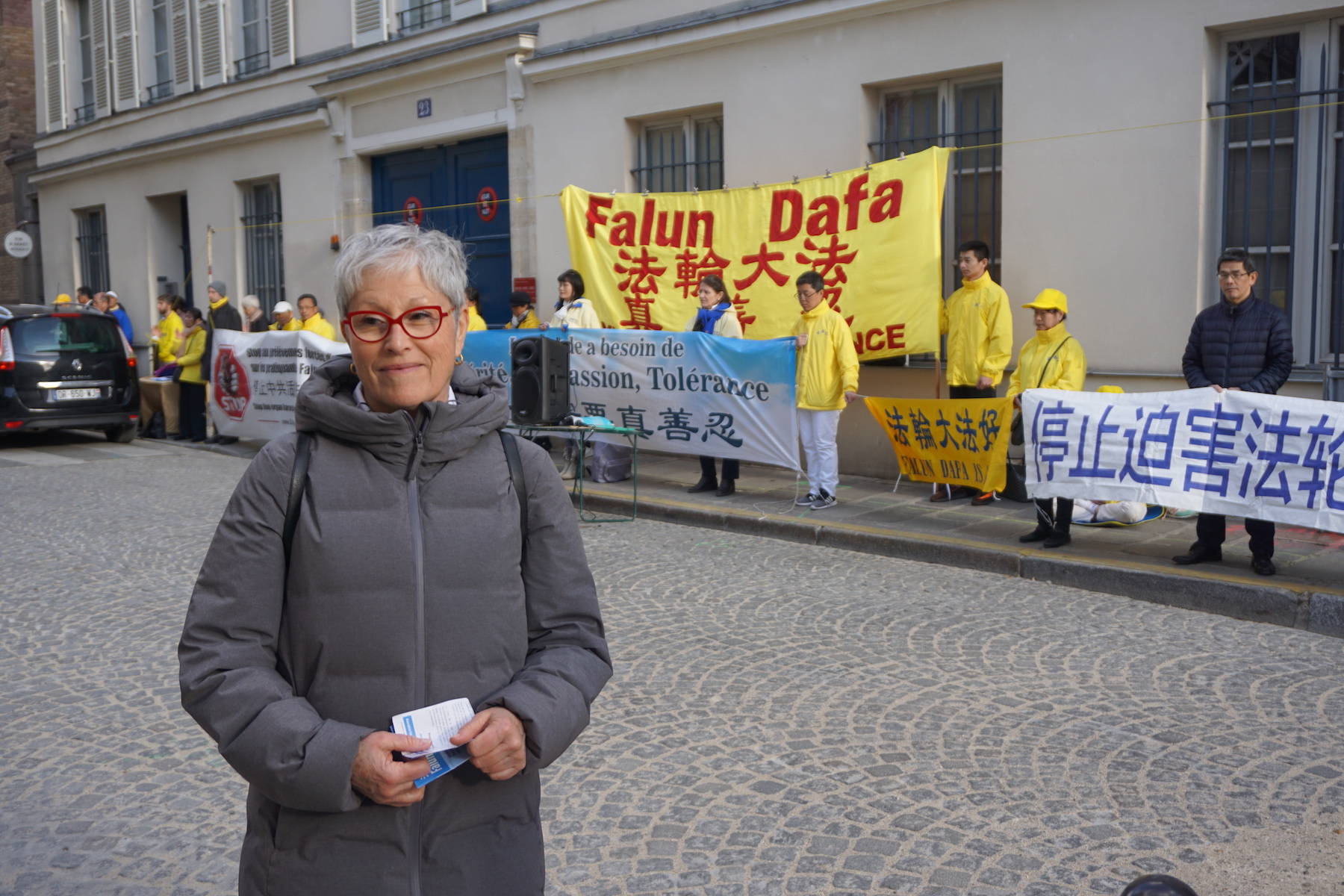 法国一所公共机构的项目负责人桑德琳(Sandrine)女士在了解到活动的主题后表示,感动于法轮功学员的和平抗争精神。她说:“我非常受触动,这样的人群竟会受到压迫,我觉得必须让人们知道,揭露出来。我支持这样的抗争。我深受感动,尤其他们是为了和平而抗争。”
