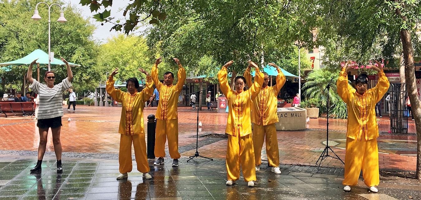 牙科医生乔安娜(Joanna)当天正在附近工作,被法轮功祥和的炼功音乐吸引,她和法轮功学员交谈很久,希望了解详尽真相。