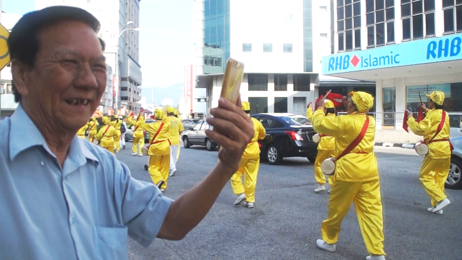 图4:怡保当地民众卢先生开心的观看法轮功游行队伍。