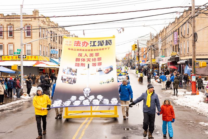 紧随其后是三大方阵:“法轮大法好”、“停止迫害法轮功”、“声援三亿人退出中共党团队”,并有功法演示、彩旗、横幅、花船、腰鼓、舞龙、舞狮等不同主题的队列,吸引了很多民众驻足观看。其中的大型中英文《转法轮》书模型,“法轮大法好”和“中国共产党亡”以及“法办江泽民”的大型竖幅尤其震撼人心。