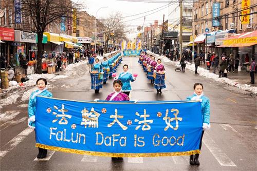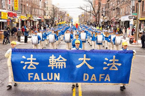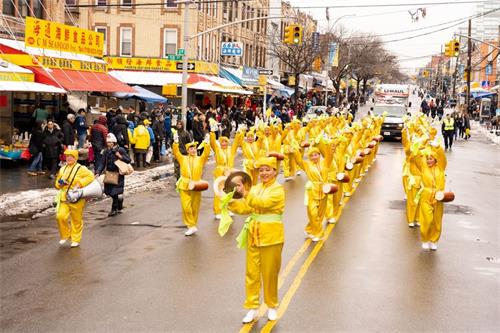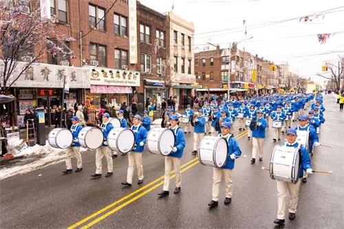 游行由“天国乐团”开道,一百六十名训练有素的乐手们排列整齐,气势如虹。《法轮大法好》、《神圣的歌》、《送宝》等乐曲响彻街头巷尾,乐团所到之处,民众顿时被吸引。