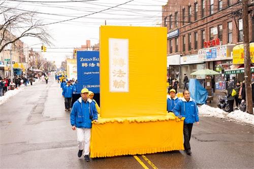 紧随其后是三大方阵:“法轮大法好”、“停止迫害法轮功”、“声援三亿人退出中共党团队”,并有功法演示、彩旗、横幅、花船、腰鼓、舞龙、舞狮等不同主题的队列,吸引了很多民众驻足观看。其中的大型中英文《转法轮》书模型,“法轮大法好”和“中国共产党亡”以及“法办江泽民”的大型竖幅尤其震撼人心。