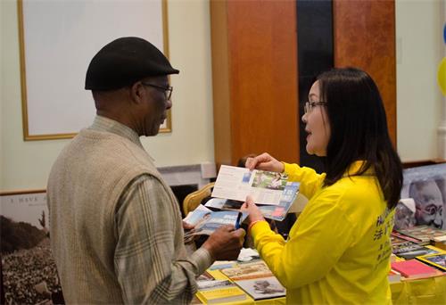 在当天的活动中,很多民众来到法轮功展位前了解法轮大法的真相,并接过介绍法轮大法的资料。