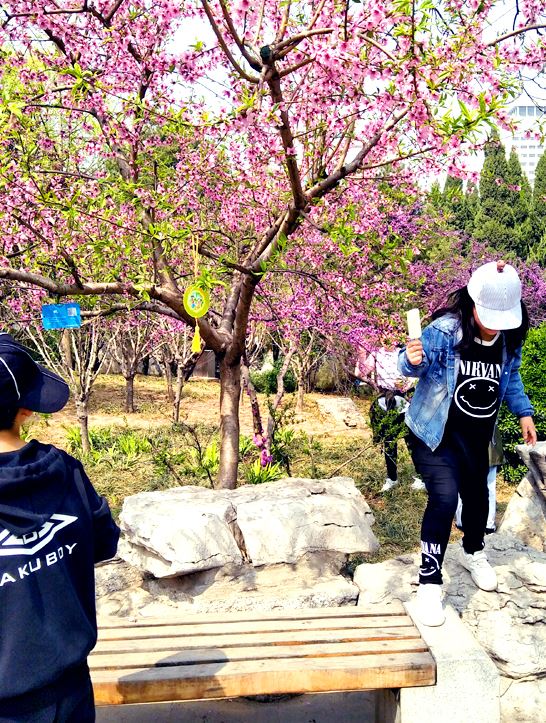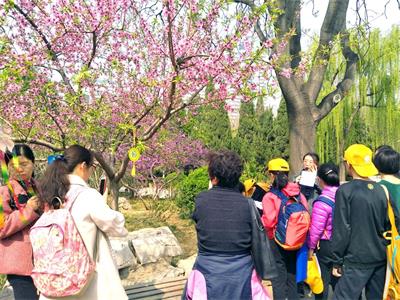 从树下过往的人川流不息,照相、看花、看这个小光盘挂件。还有导游走到这棵树下,带着一群学生站在那里讲解……也有人坐在树下吃东西或休息。很多人围着这棵树。