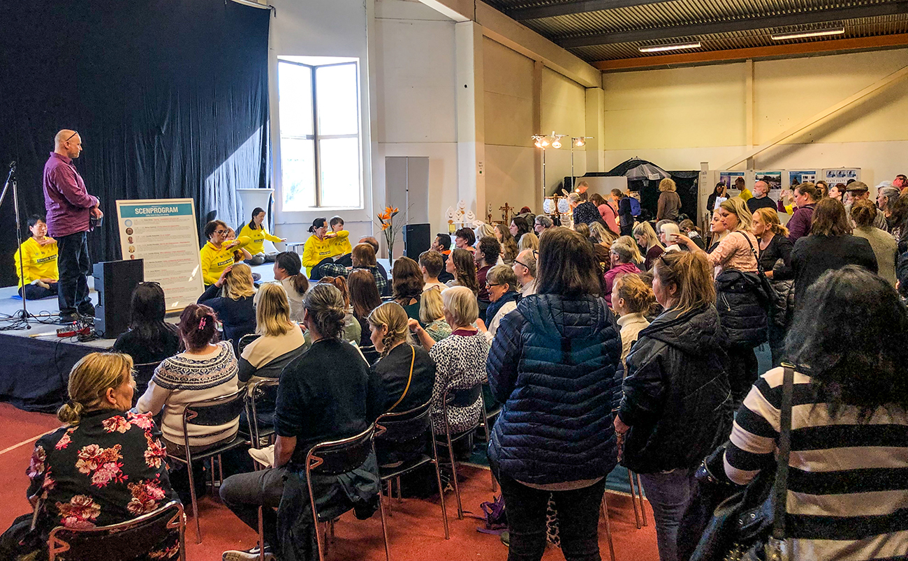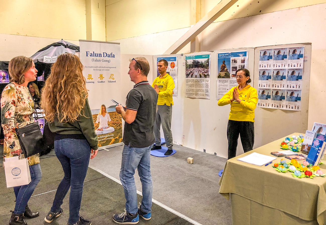 法轮功(又称法轮大法)以其改善身体和精神健康的神奇功效,深受瑞典民众的喜爱,瑞典法轮功学员每年都被主办方邀请参加展会。几乎每次都是安排在离展览大厅的表演舞台很近的位置上,这里是参观者的必经之路。