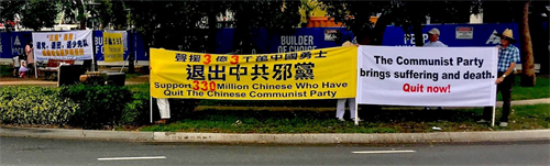 当天,还有一位刚从大陆来到澳洲的年轻人,他也来了解真相,并表示支持法轮功学员对迫害的和平抗争。他告诉学员,他在中国大陆曾因崇尚民主自由遭到了残酷迫害,并产生过轻生的念头。学员鼓励他要珍惜生命,在澳洲自由的国土上,多了解真相,让生命更有意义。他说:“谢谢你,我不会再去想自杀了。我来过你们这里,了解了中共对法轮功的迫害,我支持法轮功,我还会继续来。”