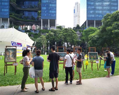 当天途经芳林公园的各国游客和在新加坡工作生活的民众,有的停下脚步与法轮功学员攀谈,有的驻足观看展板,也有的录影拍照留念。不少人因初次听闻法轮功真相,希望了解更多资讯。