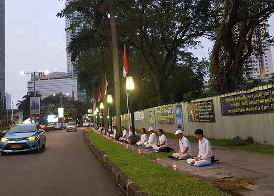 四月二十日,印尼雅加达法轮功学员在中使馆前集会以纪念“四·二五”逾万名法轮功学员和平上访二十周年。