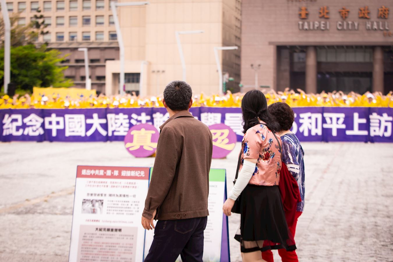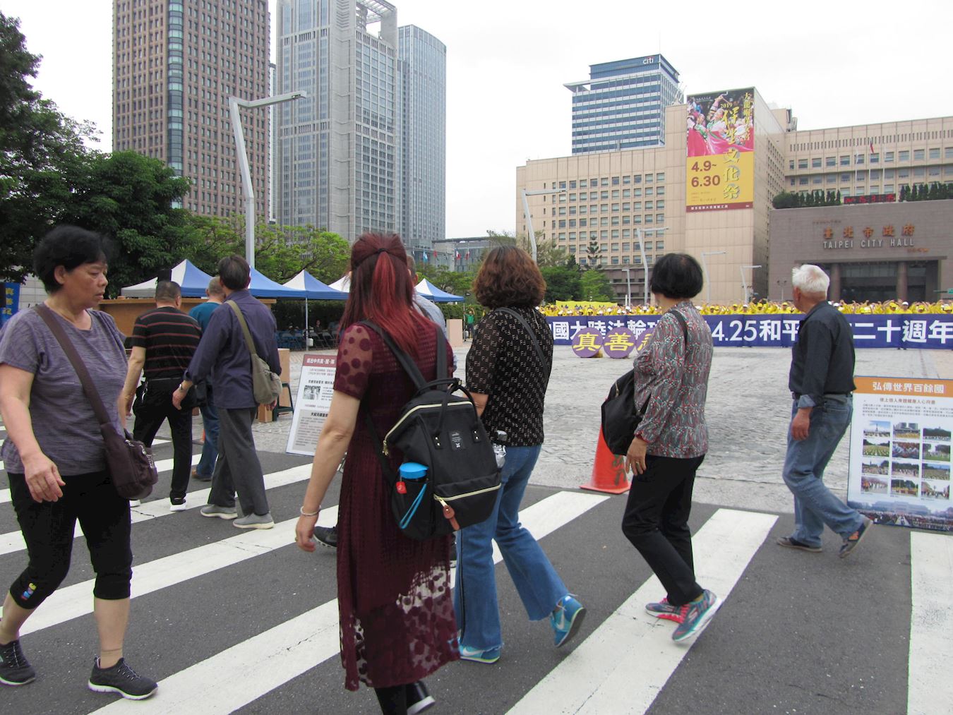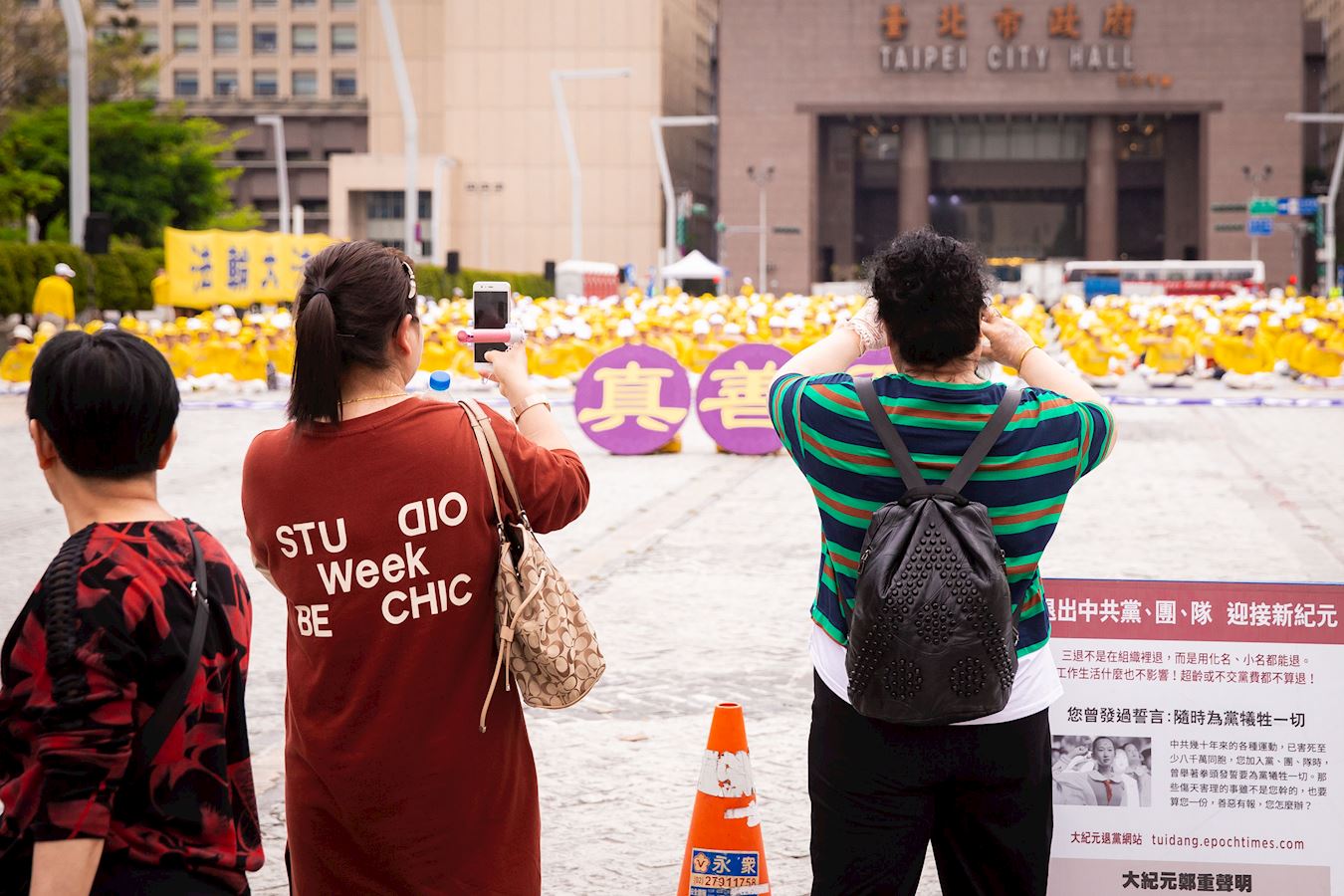 法轮功学员集会炼功的场面庄严殊胜又祥和,深深吸引过路行人和旅客的目光,有的驻足、有的举起手机拍照,也有的在展板前细阅真相。一团接着一团的中国游客,有的打从国父纪念馆景点出来,经过市民广场走向距离不远的台北101大楼景点,有的则是从101大楼往国父纪念馆方向而来,看到集会场景惊呼:“法轮功!”不少人感叹这里真自由。许多人拿起相机拍摄或录像,即使队伍中有人嚷嚷着:不要拍、不要看;但也不乏明白真相的导游说:这是言论自由和集会自由的人权,在台湾是合法的。