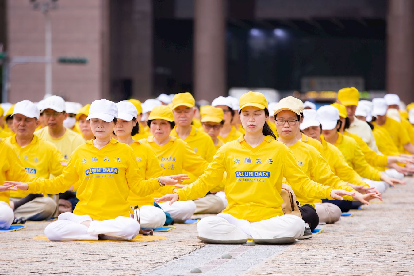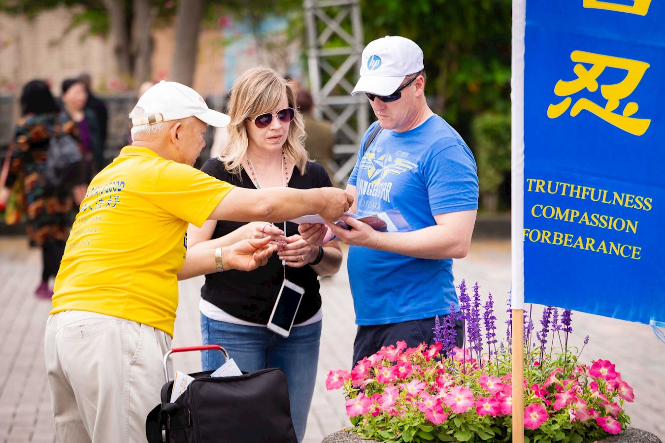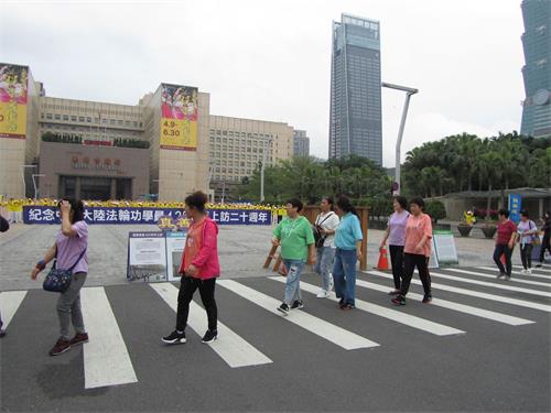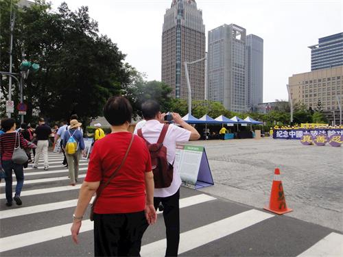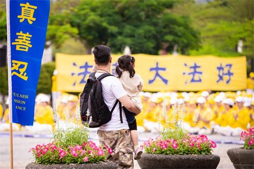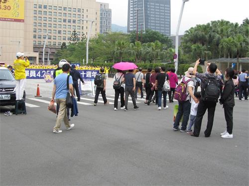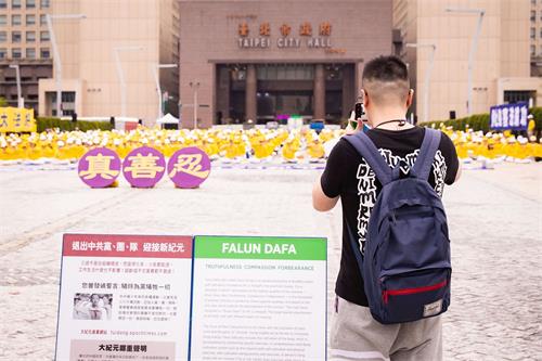 法轮功学员集会炼功的场面庄严殊胜又祥和,深深吸引过路行人和旅客的目光,有的驻足、有的举起手机拍照,也有的在展板前细阅真相。一团接着一团的中国游客,有的打从国父纪念馆景点出来,经过市民广场走向距离不远的台北101大楼景点,有的则是从101大楼往国父纪念馆方向而来,看到集会场景惊呼:“法轮功!”不少人感叹这里真自由。许多人拿起相机拍摄或录像,即使队伍中有人嚷嚷着:不要拍、不要看;但也不乏明白真相的导游说:这是言论自由和集会自由的人权,在台湾是合法的。