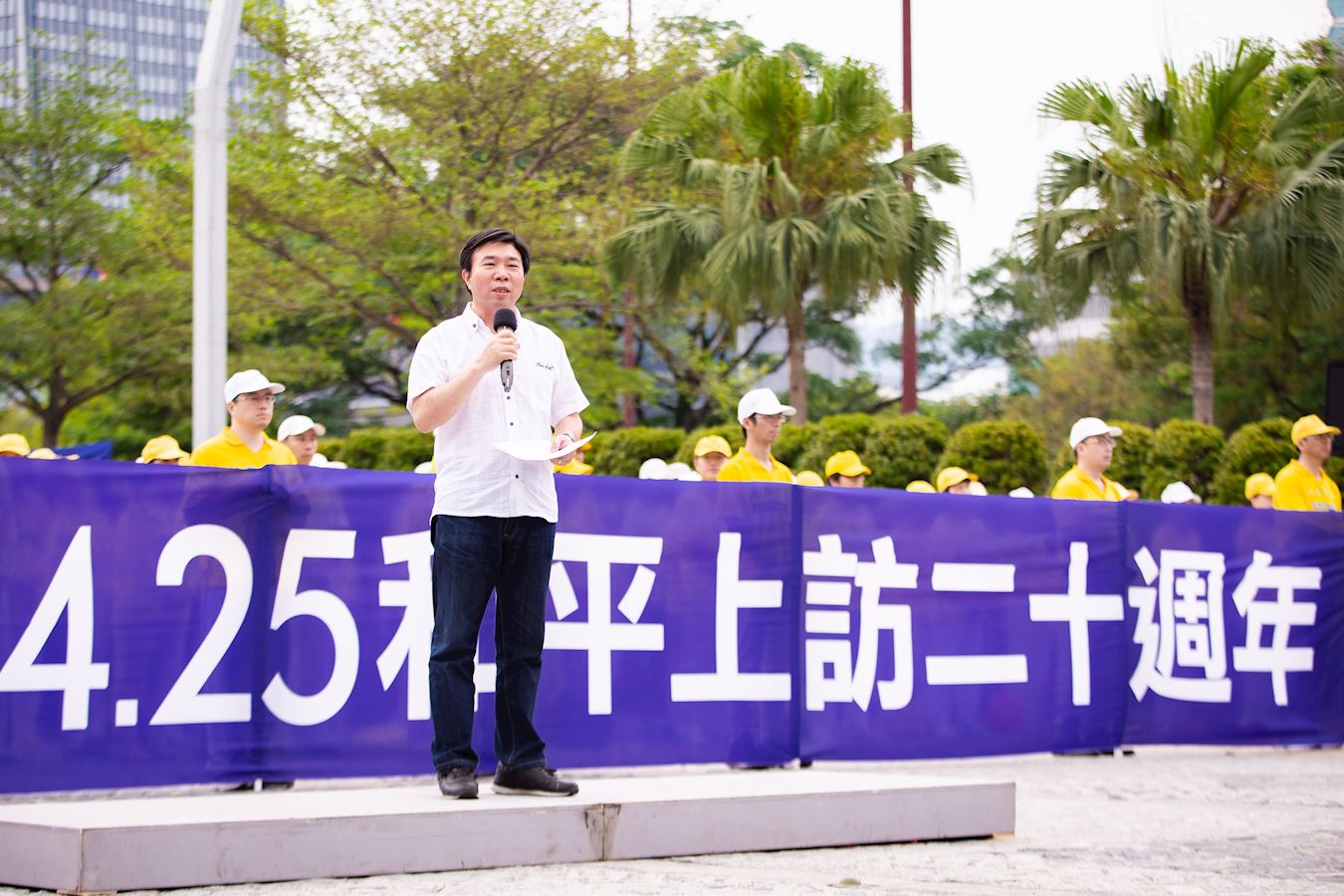 集会上,台湾法轮大法学会理事长张锦华表示,四·二五事件在世人眼前,所展现出的理性平和与道德文明,受到国内外一致肯定和赞扬。但不幸的是,中共党𣁽江泽民竟将和平上访歪曲造谣为“围攻中南海”,并发动党政暴力机器,滥权抓捕、酷刑迫害,无法无天的程度,国际社会已通过多项宣言或法案严辞谴责。