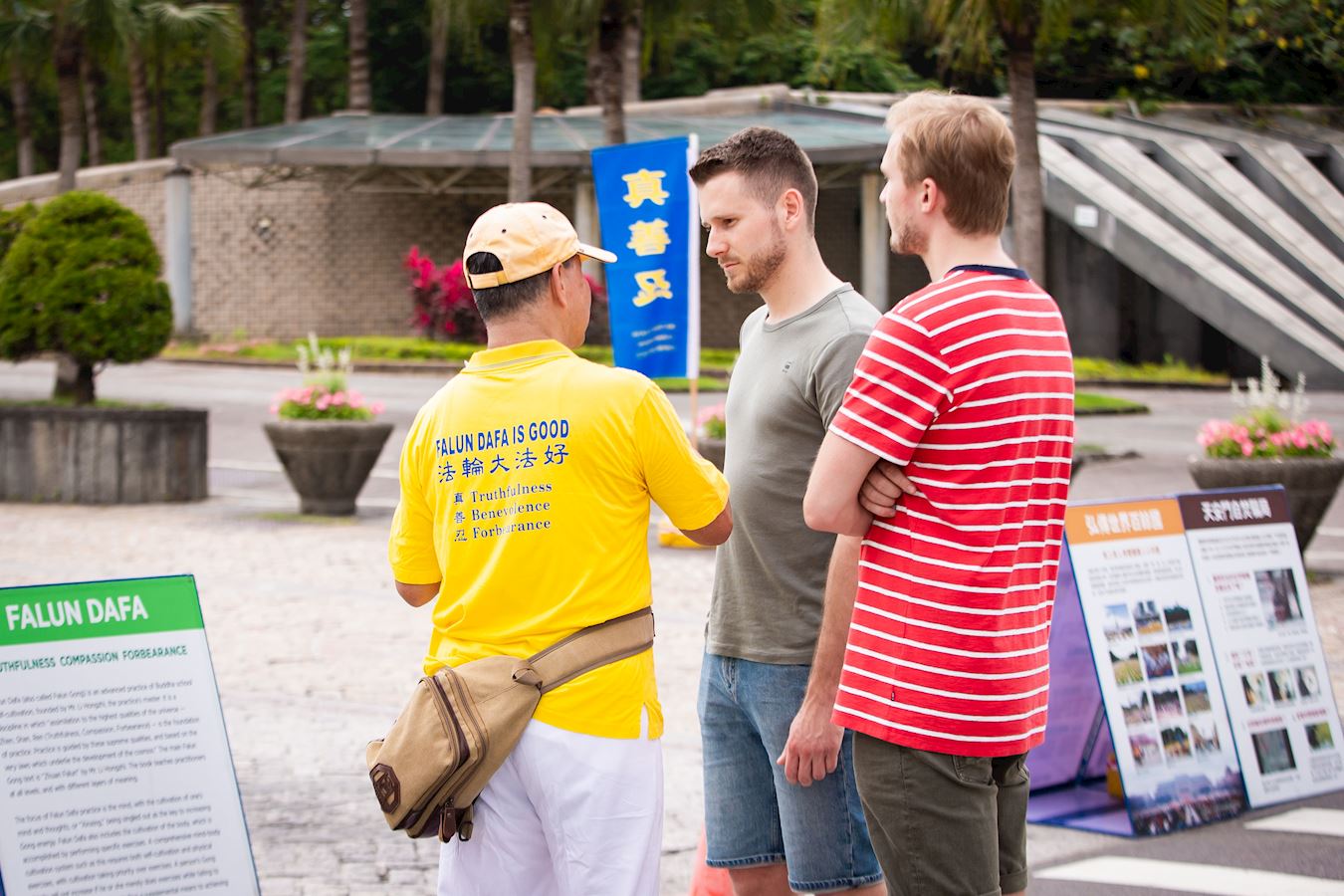 史达吉·格迪克(Stage Geadink)和托马斯·范·霍尔德(Thomas Van Holder)两位外籍青年,经过集会的场合,不但拿起相机拍摄,更主动向在场学员询问集会诉求。他们表示,第一次来到台湾旅旅游,也是第一次听闻法轮功这个功法。他们后来明白,法轮功在台湾可以自由学炼;而在中国,却因为人多遭到中共的打压和迫害。他们表示:看到一群学员静坐的画面,他们感到法轮功是“祥和(Peaceful)”、“正的能量(Energy)”的功法。