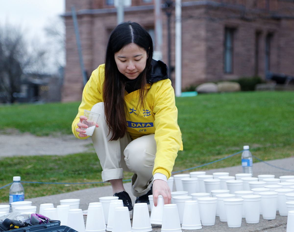 修炼五年的Ruby今年二十岁,就读多伦多大学二年级。她交流说:“我们在开始前发正念,过程中,雨水渐渐变少。巡警告知我们,在排放蜡烛的路面两侧需留五十厘米给行人经过,当快完成时,又告知需要留出八十厘米。大家立即调整,毫无怨言。有时我们会碰倒杯子,有时风会把杯子吹走。快结束摆放的时候,发现杯子的数量不够,有人赶紧跑到附近的商店去买杯子。”