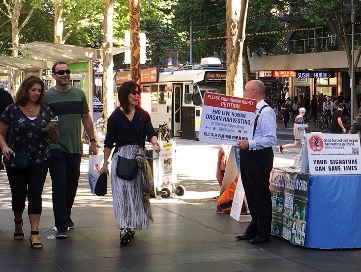 ![]() 图1:墨尔本法轮功学员马克·贝特曼(Marc Bateman)在市中心城市广场征集民众的支持签名。 |