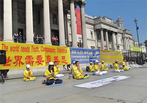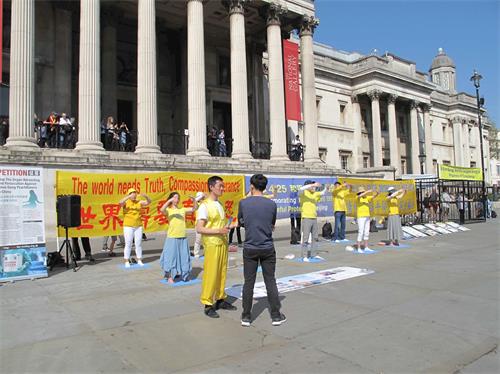 '图1~4:二零一九年四月二十一日,英国法轮功学员在位于伦敦市中心的特拉法加广场(Trafalgar Square)北平台集体炼功、发传单、讲真相、征签反迫害,纪念“四·二五”和平上访二十周年。'