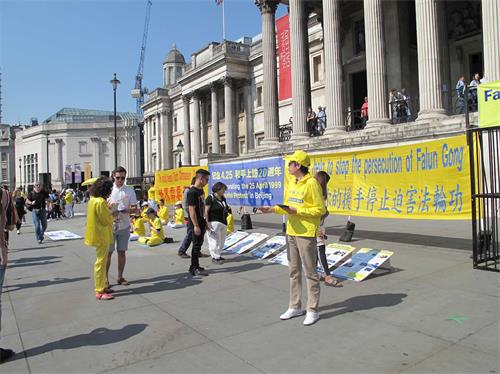 图12:美国音乐人大卫·哈里斯(David Harris)在特拉法加广场(Trafalgar Square)北台阶认真了解真相后由衷赞叹法轮功。