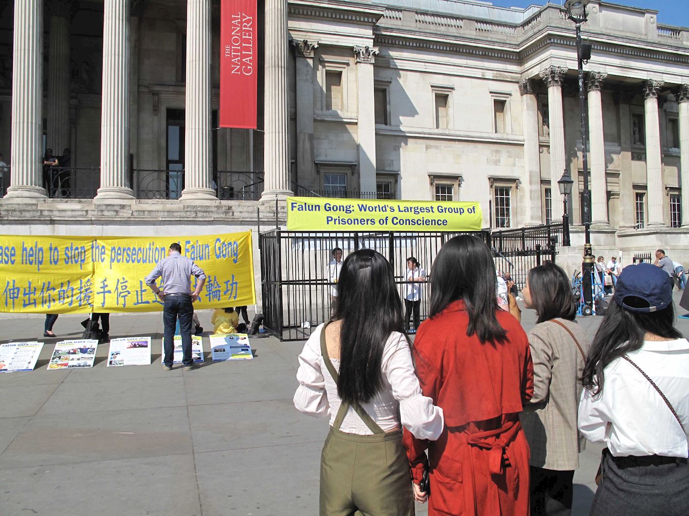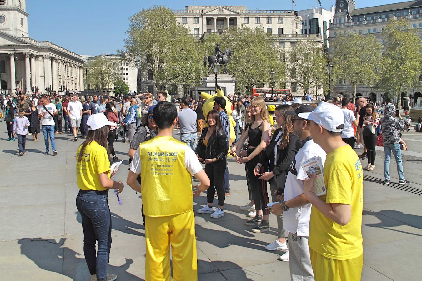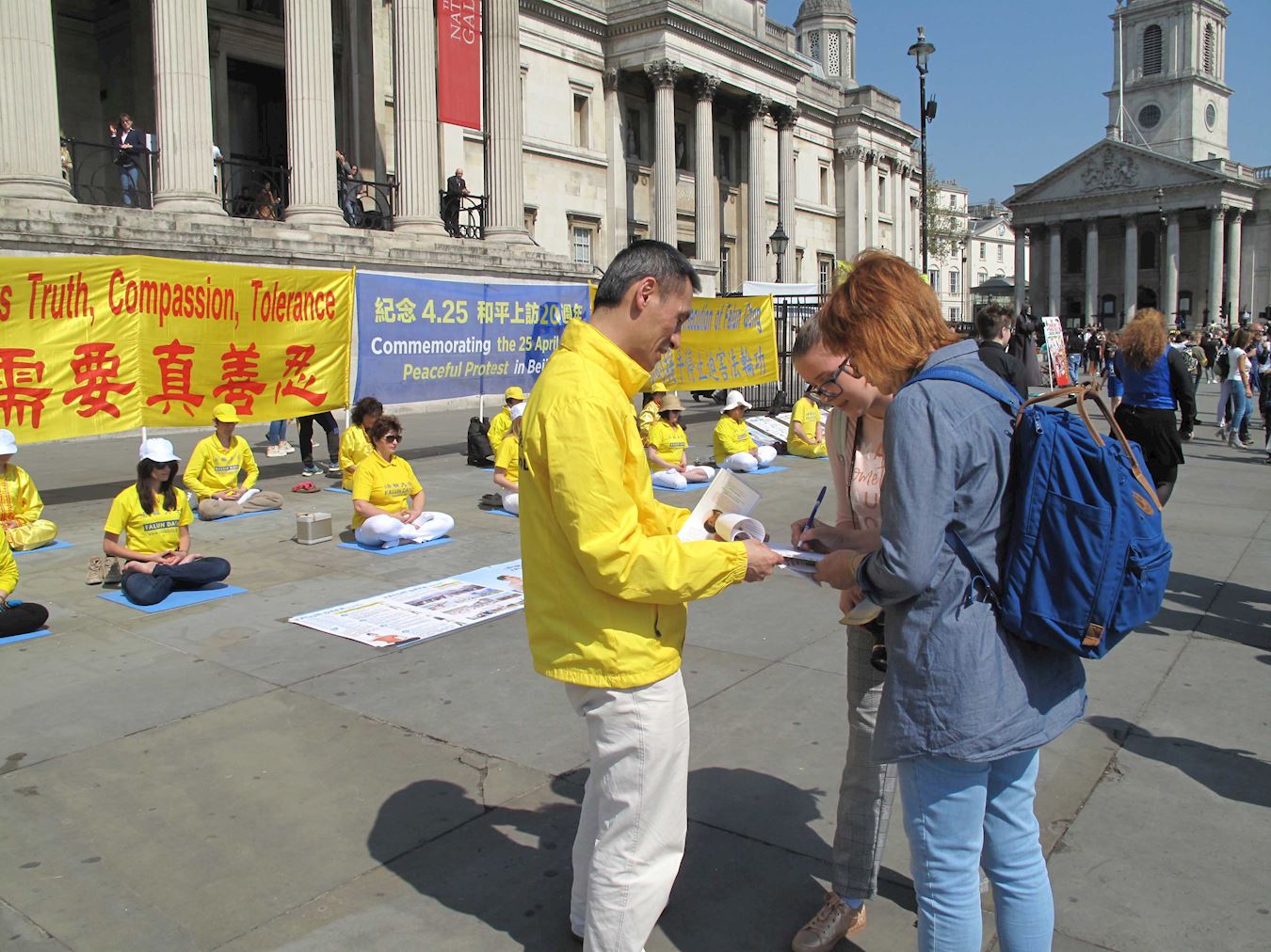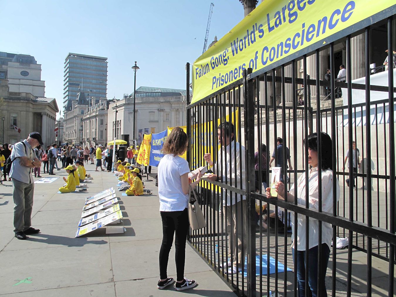 四月二十一日适逢复活节,爱沙尼亚中学生玛利亚(Maria)和妈妈艾丽(Ela)利用复活节假期来伦敦旅游,在特拉法加广场第一次遇见法轮功。她们说:“看到人们因为炼功而被伤害,我感到难过,让我为未来感到非常担心。”“他们(法轮功学员)就是想变得更好,每个人都接受别人,互相善待,我认为这是非常美好的信息,真需要去传播这样的信息,世界,包括欧洲真需要了解这些。”