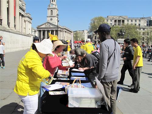 当天活动中,学员们通过炼功、发传单、讲真相和征签等活动,以理智平和的精神风貌向来自世界各地的广大民众展示法轮大法的美好,揭露中共二十年来残酷迫害法轮功、活摘法轮功学员器官的罪行。恰逢复活节假期,游客很多,了解真相后,人们纷纷签名支持制止迫害。有民众感受到祥和的能量场而现场学炼法轮功。